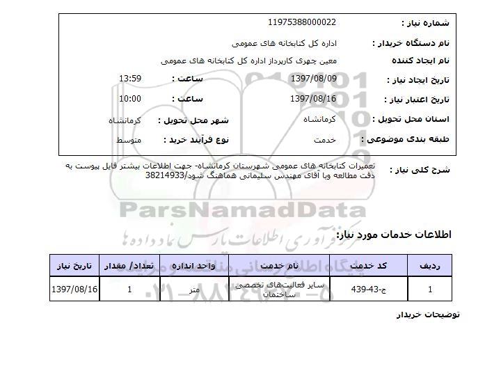 شرح کلی نیاز : تعمیرات کتابخانه های عمومی شهرستان کرمانشاه - جهت اطلاعات بیشتر فایل پیوست به دقت مطالعه و با آقای مهندس سلیمانی هماهنگ شود / 38214933