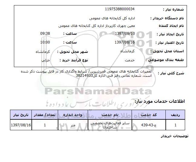 شرح کلی نیاز:  تعمیرات کتابخانه های عمومی قصرشیرین/ شرایط واگذاری کار در فایل پیوست ذکر شده است. شماره تماس دفتر فنی اداره کل 38214933