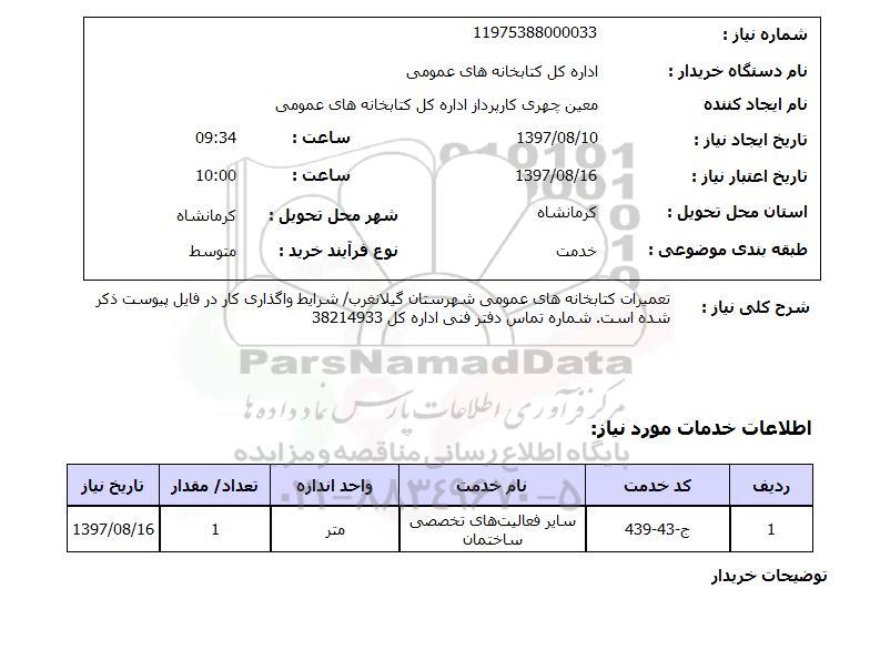 شرح کلی نیاز : تعمیرات کتابخانه های عمومی شهرستان گیلانغرب / شرایط واگذاری کار در فایل پیوست ذکر شده است. شماره تماس دفتر فنی اداره کل 38214933