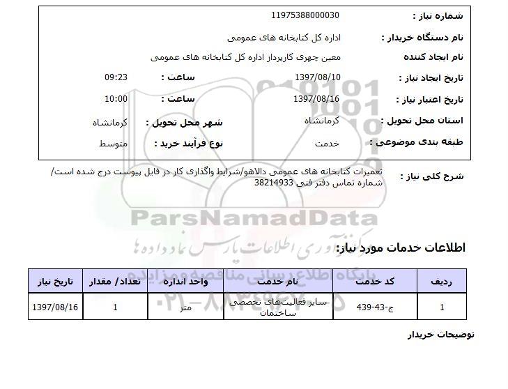 شرح کلی نیاز: تعمیرات کتابخانه های عمومی دالاهو/ شرایط واگذاری کار در فایل پیوست درج شده است شماره تماس دفتر فنی 38214933