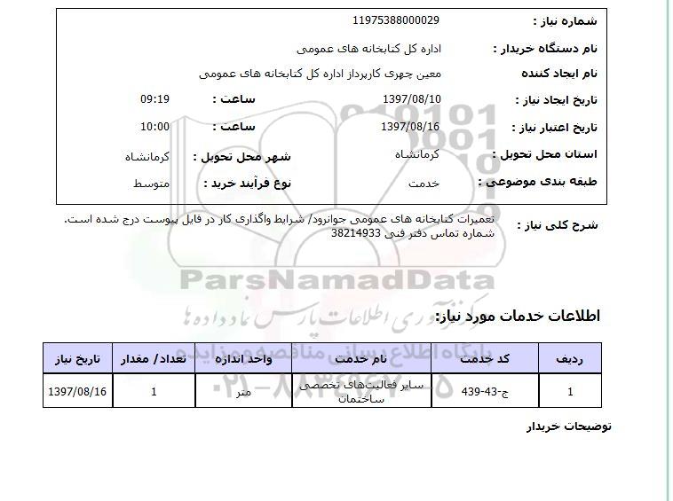 شرح کلی نیاز   تعمیرات کتابخانه های عمومی جوانرود   شرایط واگذاری کار در فایل پیوست درج شده است  شماره تماس دفتر فنی 38214933