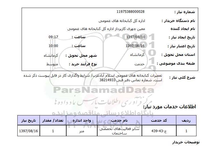 شرح کلی نیاز تعمیرات کتابخانه های عمومی اسلام آباد غرب شرایط واگذاری کار در فایل پیوست درج شده است شماره تماس دفتر فنی 38214933