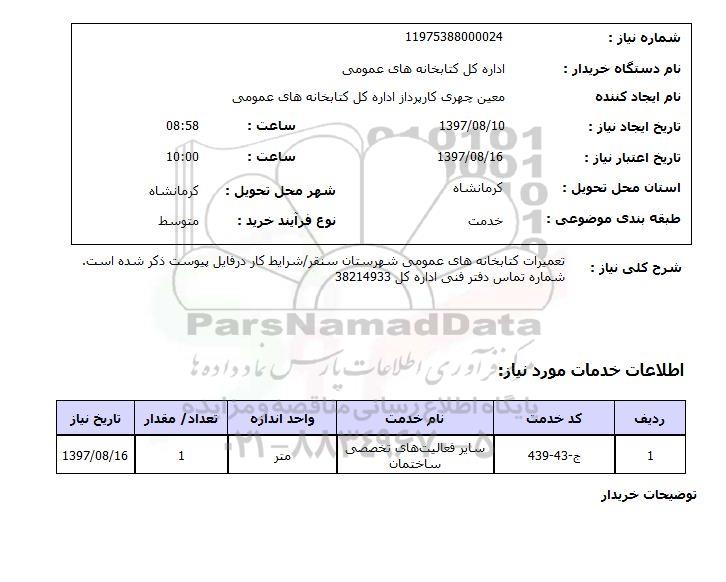 شرح کلی نیاز:  تعمیرات کتابخانه های عمومی شهرستان سنقر / شرایط کار در فایل پیوست ذکر شده است.