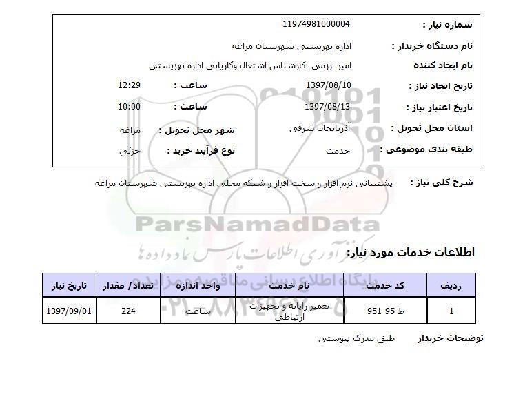 شرح کلی نیاز: پشتیبانی نرم افزار و سخت افزار و شبکه محلی اداره بهزیستی شهرستان مراغه