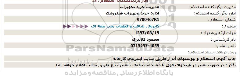 اداره برگزارکننده استعلام: اداره خرید تجهیزات هیدرولیک
