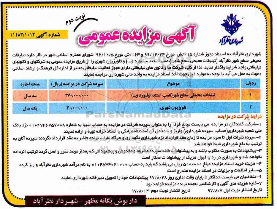 شهرداری نظرآباد در نظر دارد به استناد مجوز شماره 215/ ش به تاریخ 96.12.24 و 163/ ش به تاریخ 96.12.25 شورای محترم اسلامی شهر در نظر دارد تبلیغات محیطی سطح شهر نظرآباد (نصب استند، بیلبورد و ...) را از طریق مزایده عمومی به شرکتها و کانونهای تبلیغاتی واجد شرایط واگذار نماید. لذا از کلیه شرکتها و کانونهای تبلیغاتی دارای مجوز فعالیت تبلیغاتی معتبر از اداره کل فرهنگ و ارشاد اسلامی دعوت به عمل می آید با توجه به موارد ذیل جهت اخذ اسناد مزایده به واحد مالی شهرداری مراجعه نمایند