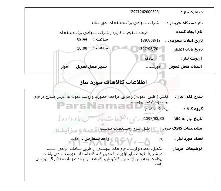 شرح کلی نیاز: کفش (طبق نمونه) از طریق مراجعه حضوری و روئیت نمونه به آدرس مندرج در فرم پیشنهادی قیمت پیوست