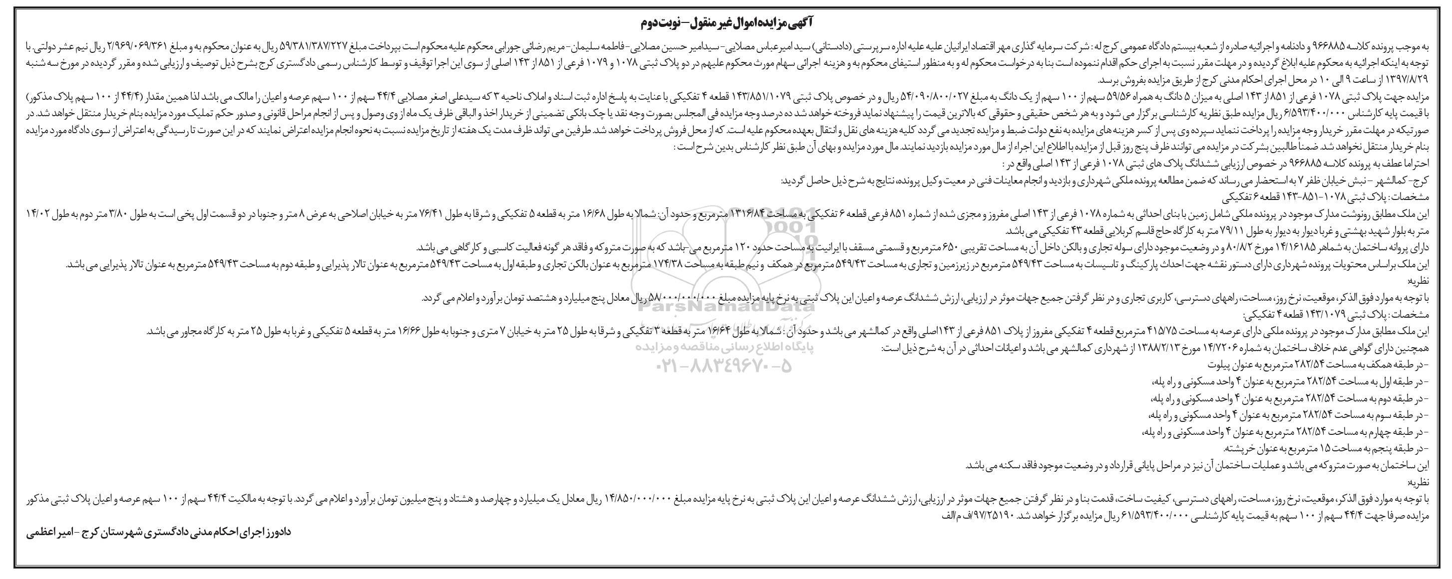 مزایده پلاک ثبتی 1078 فرعی از 851 از 143 اصلی کلاسه 966885