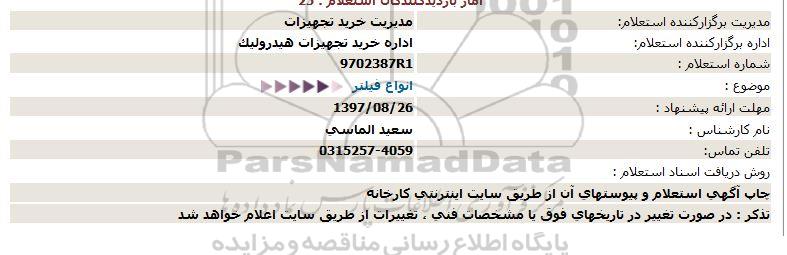 اداره برگزارکننده استعلام: اداره خرید تجهیزات هیدرولیک