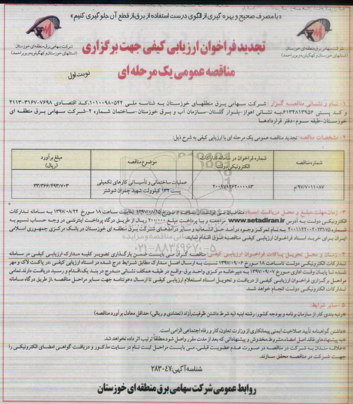 | 97/7011087/م | 200971262000083 | عملیات ساختمانی و تاسیساتی کارهای تکمیلی پست 132 کیلوولت شهید چمران شوشتر |