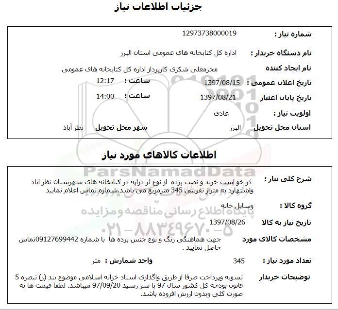 شرح کلی نیاز: درخواست خرید و نصب پرده از نوع لردراپه در کتابخانه های شهرستان نظر آباد و اشتهارد به متراژ تقریبی 345 متر مربع می باشد. شماره تماس اعلام نمایید