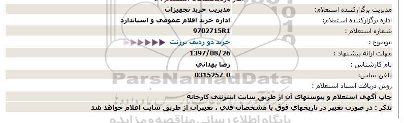 اداره برگزارکننده استعلام: اداره خريد اقلام عمومی و استاندارد