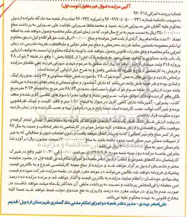 مزایده یک باب واحد مسکونی به پلاک ثبتی 1 از 5554 پرونده 960318 نوبت اول