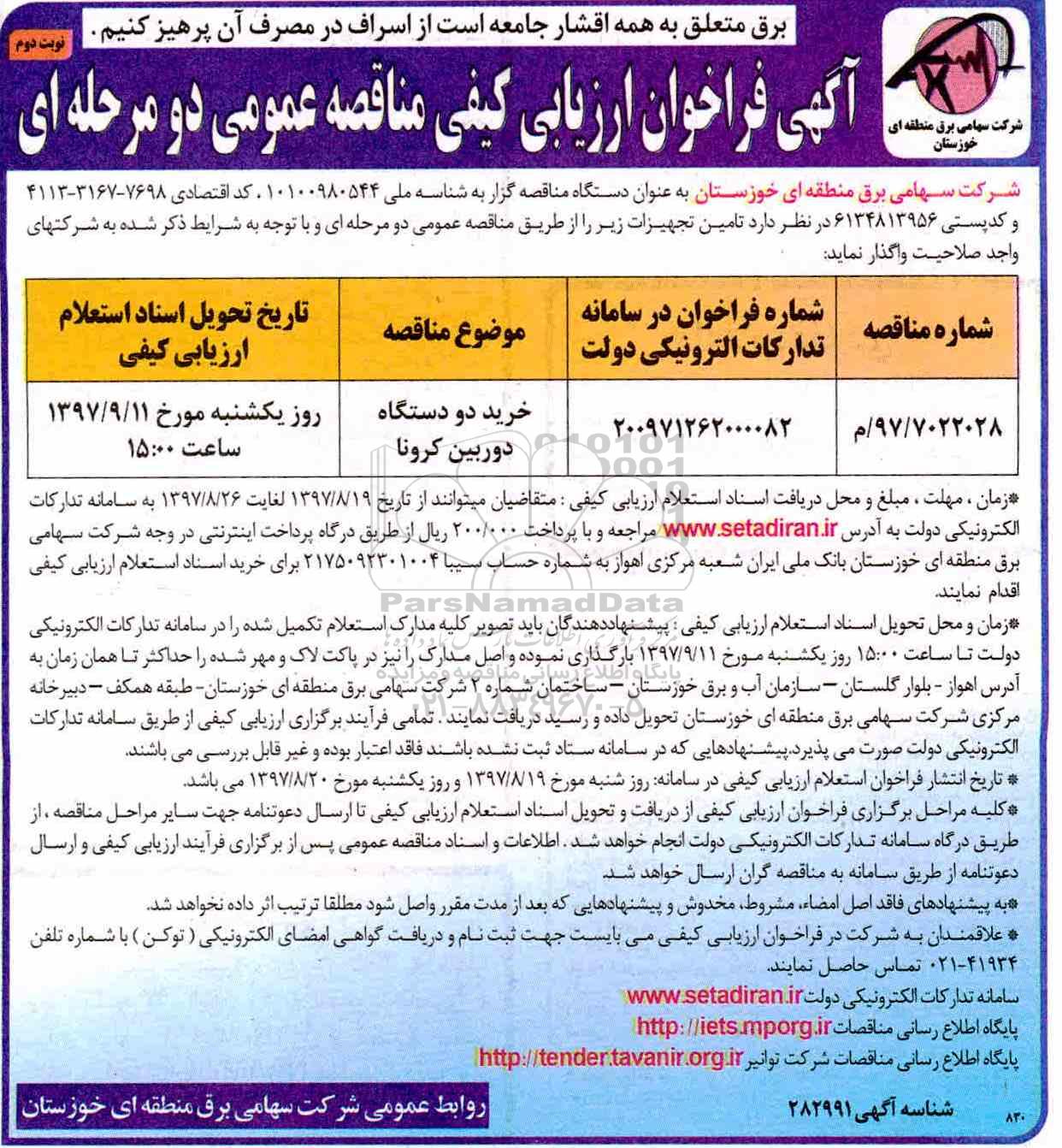 تاریخ انتشار فراخوان استعلام ارزیابی کیفی در سامانه ستاد: روز شنبه مورخ 97.08.19 و روز یکشنبه مورخ 97.8.20 می باشد.
