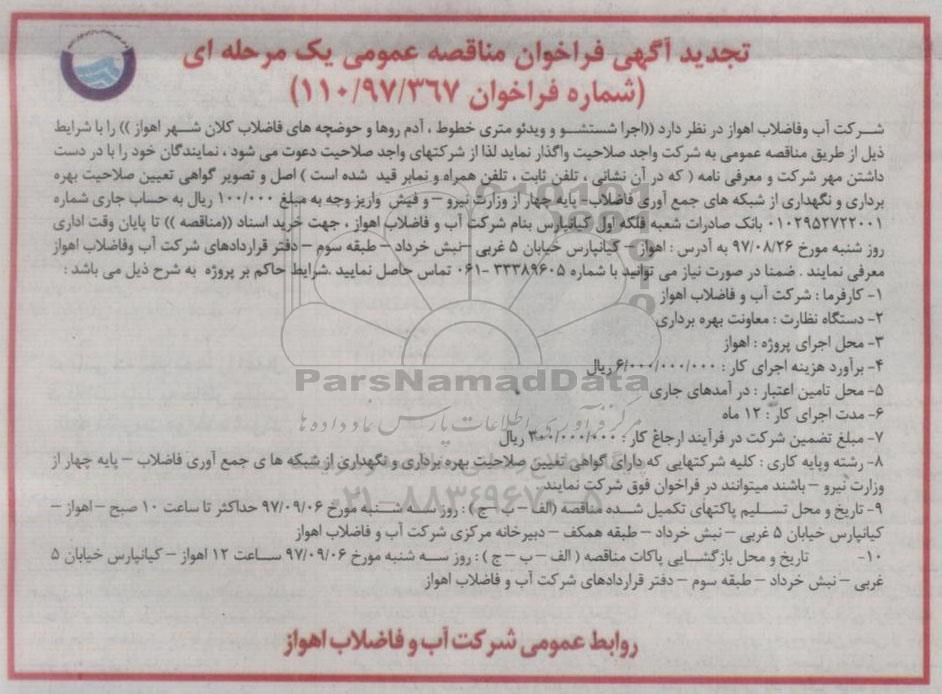 تجدید فراخوان اجرا شستشو و ویدئو متری خطوط، آدم روها از کلیه افراد متخصص و شرکتها واجد شرایط دعوت به عمل میآید در مناقصه با کد خبرگزاری پارس نماد: 1369426 شرکت نمایند.