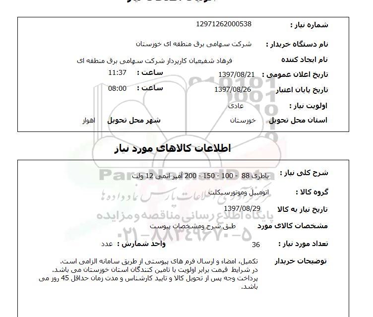 شرح کلی نیاز: باطری 88-100-150-200 آمپر اتمی 12 ولت