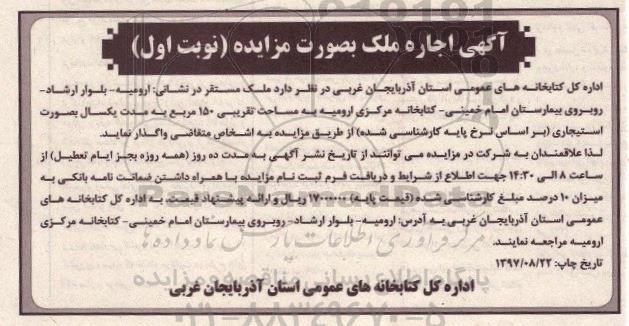 اداره کل کتابخانه های عمومی استان آذربایجان غربی در نظر دارد ملک مستقر در نشانی: ارومیه - بلوار ارشاد - روبروی بیمارستان امام خمینی - کتابخانه مرکزی ارومیه به مساحت تقریبی 150 متر مربع به مدت یکسال به صورت استیجاری (براساس نرخ پایه کارشناسی شده) ازطریق مزایده به اشخاص متقاضی واگذار نماید.