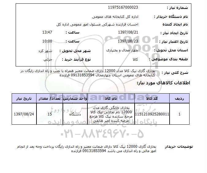 شرح کلی نیاز: بخاری گازی نیک کالا مدل 12000 دارای ضمانت معتبر همراه با نصب و راه اندازی رایگان در کتابخانه های عمومی استان چهارمحال 09131853594 فرازنده