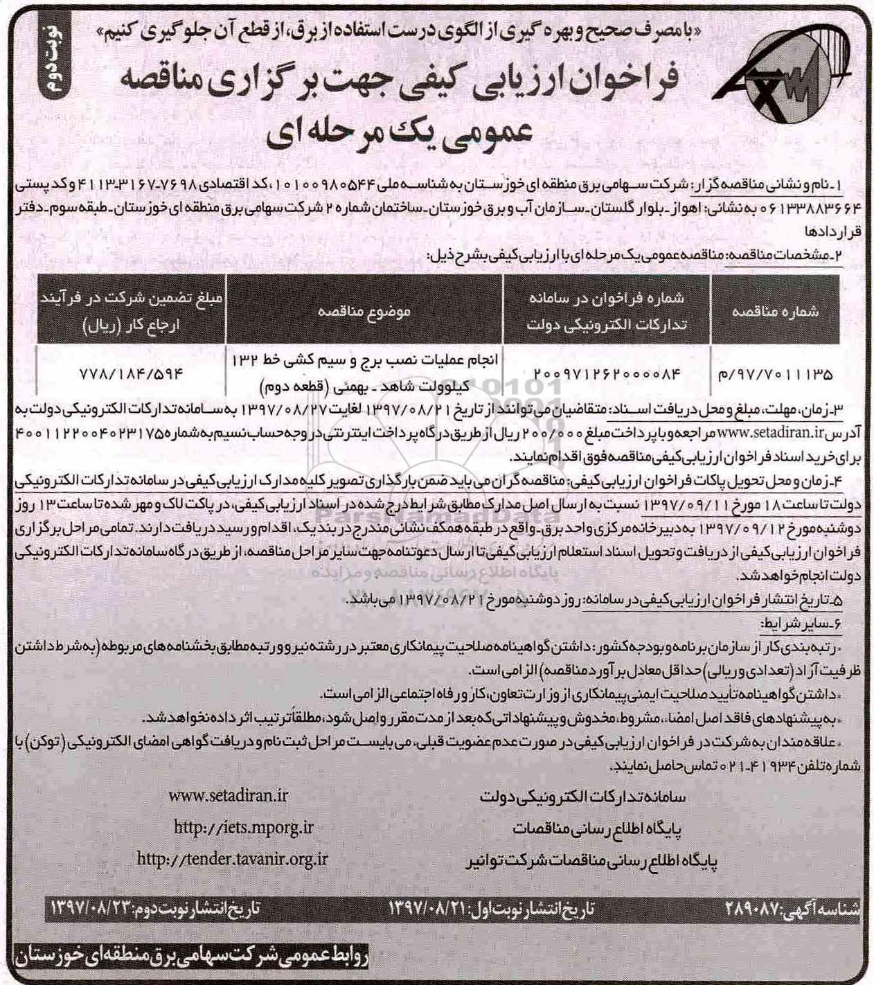 | 97/7011135/م | 200971262000084 | انجام عملیات نصب برج و سیم کشی خط 132 کیلو ولت شاهد - بهمئی قطعه دوم |