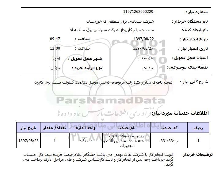 شرح کلی نیاز: تعمیر باطری شارژر 125 ولت مربوط به ترانس موبیل 132/33 کیلوولت پست برق کارون