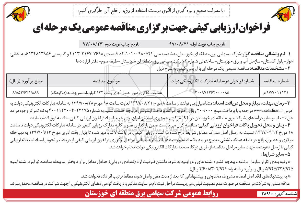 | 97/7011131/م | 200971262000085 | عملیات خاکی و دیوار حصار آجری پست 132 کیلوولت سرچشمه (دوکوهک) |