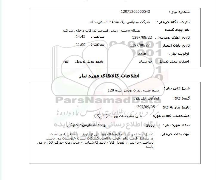 شرح کلی نیاز: سیم مسی بدون روپوش نمره 120 میلیمتر