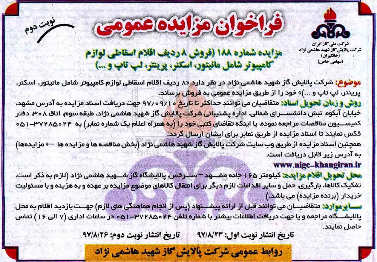 موضوع: شرکت پالایش گاز شهید هاشمی نژاد در نظردارد 8 ردیف اقلام اسقاطی لوازم کامپیوتر شامل مانیتور، اسکنر، پرینتر، لپ تاپ و...) خود را از طریق مزایده عمومی به فروش برساند.