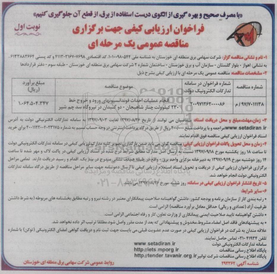 | 97/7011138 /م | 200971262000086 | انجام عملیات احداث فوندانسیونهای ورود و خروج خط 230 کیلوولت چنار شاهیجان ـ دوگنبدان در نیروگاه سد چم شیر | 1.064.504.347 |