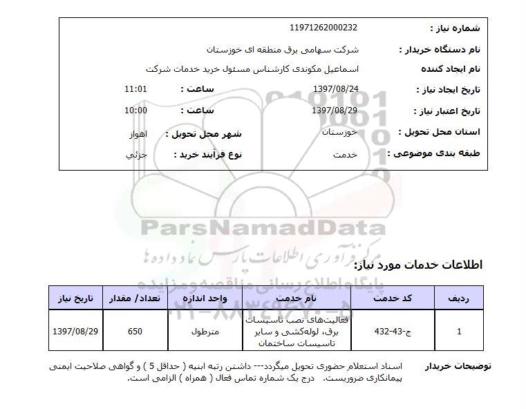 | 1 | ج-43-432 | فعالیت های نصب تاسیسات برق، لوله کشی و سایر تاسیسات ساختمان | مترطول | 650 | 97.8.29 |