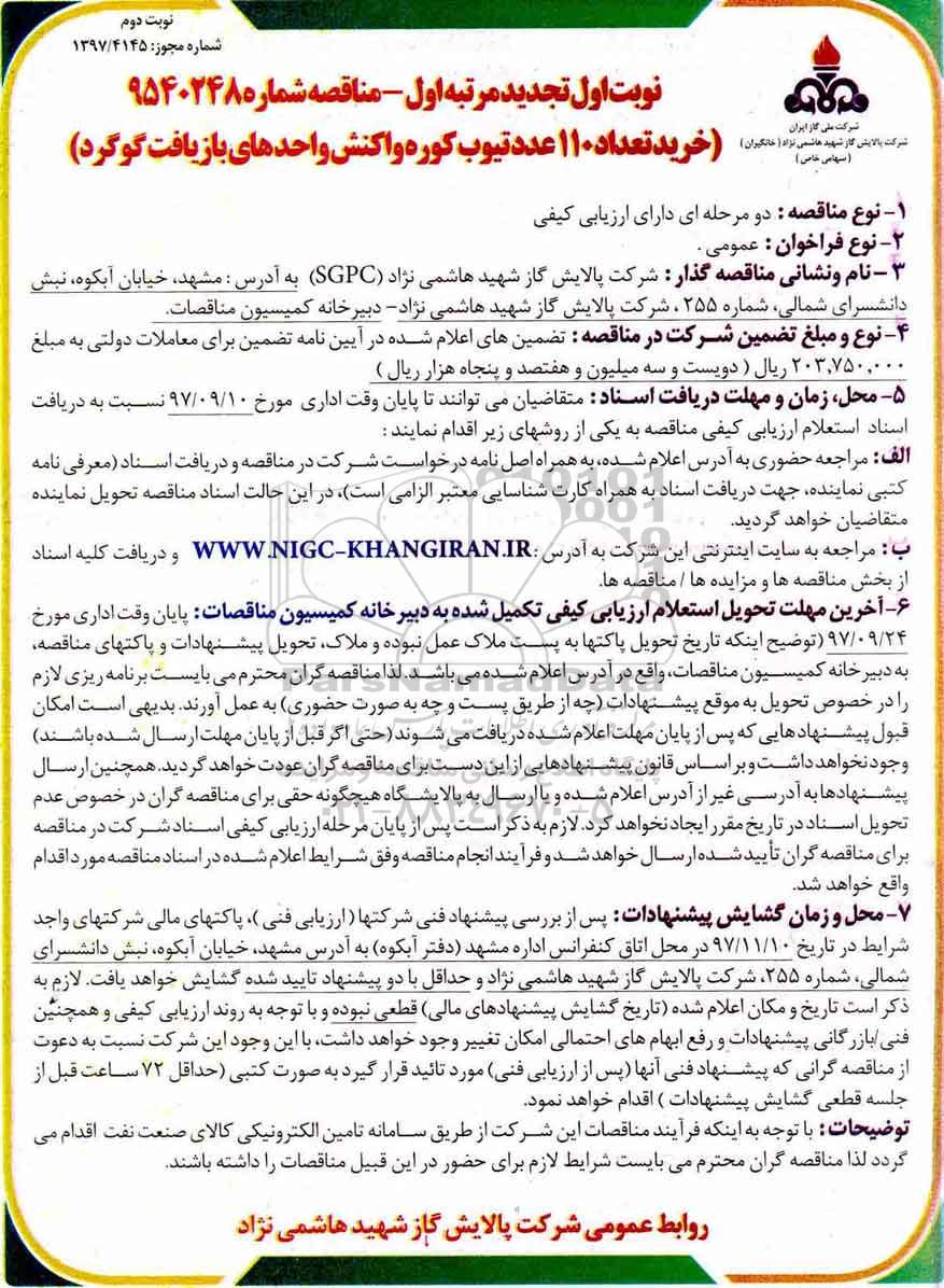 نام و نشانی مناقصه گذار: شرکت پالایش گاز شهید هاشمی نژاد SGPC به آدرس : مشهد ـ خیابان آبکوه ـ نبش دانشسرای شمالی شماره 255 شرکت پالایش گاز شهید هاشمی نژاد ـ دبیرخانه کمیسیون مناقصات