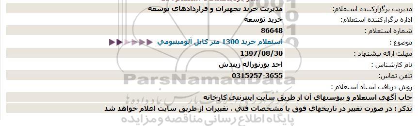 موضوع : استعلام خرید 1300 متر کابل آلومینیومی
