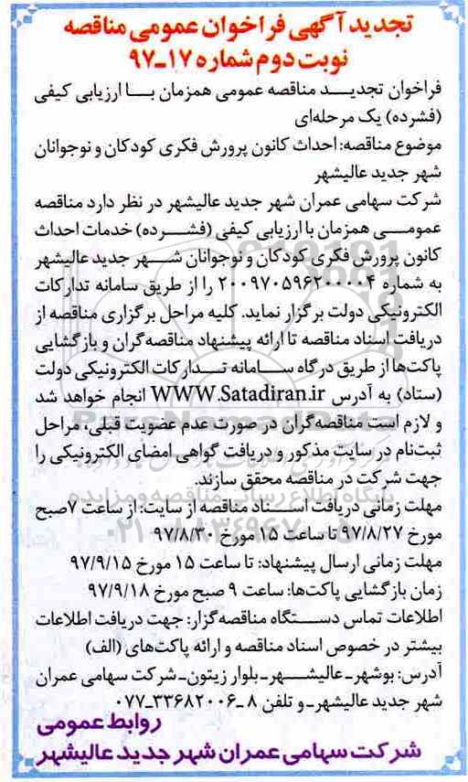 فراخوان مناقصه عمومی همزمان با ارزیابی کیفی (فشرده) یک مرحله ای موضوع مناقصه: احداث کانون پرورش فکری کودکان و نوجوانان شهر جدید عالیشهر
