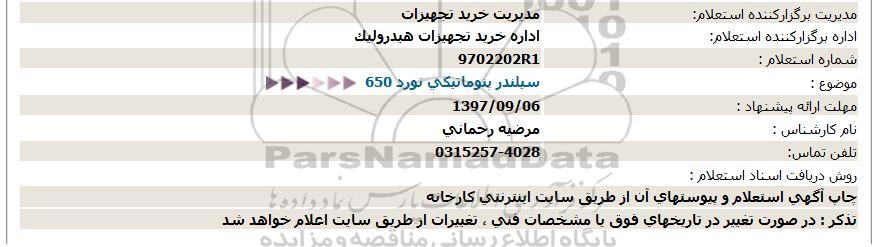 استعلام سیلندر پنوماتیکی نورد 650, استعلام, استعلام سیلندر پنوماتیکی نورد 650