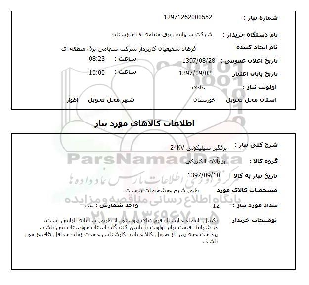 شرح کلی نیاز: برقگیر سیلیکونی 24KV