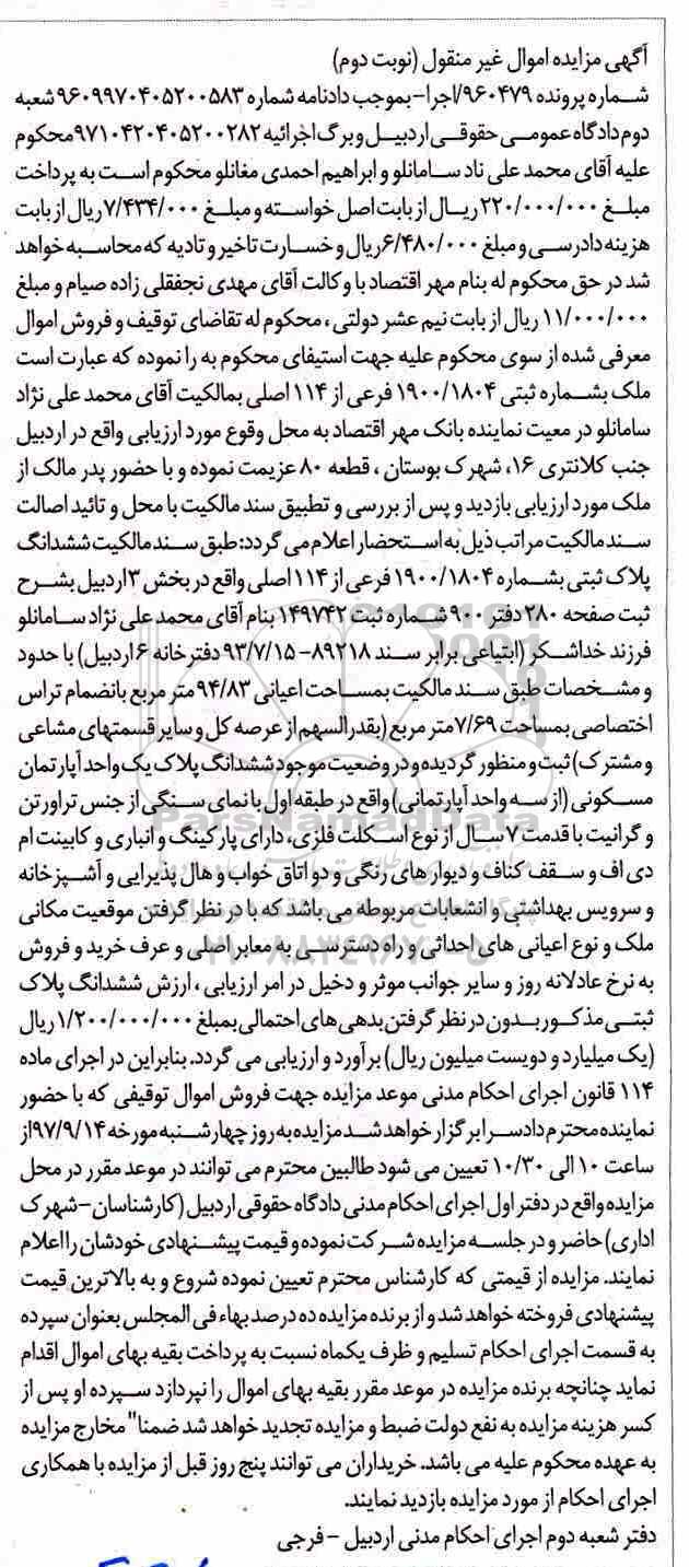 مزایده ششدانگ پلاک ثبتی شماره 1900.1804 فرعی پرونده 960479 نوبت دوم