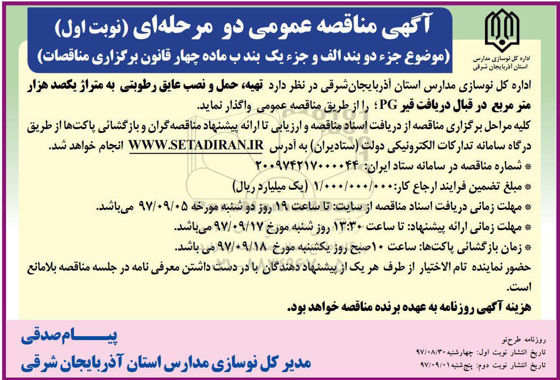اداره کل نوسازی مدارس استان آذربایجان شرقی در نظر دارد تهیه، حمل و نصب عایق رطوبتی به متراژ یکصد هزار مترمربع در قبال دریافت قیر PG را از طریق مناقصه عمومی واگذار نماید.