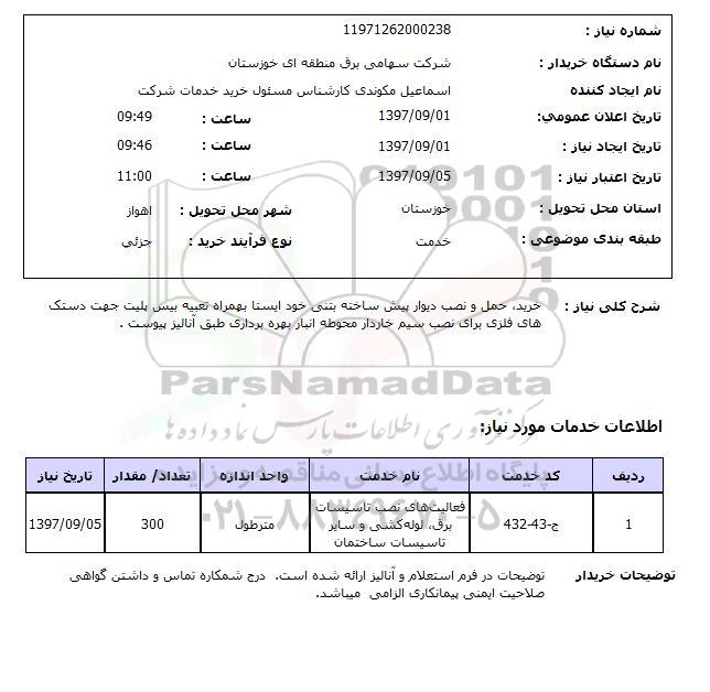 | 1 | ج-43-432 | فعالیت های نصب تاسیسات برق، لوله کشی و سایر تاسیسات ساختمان | متر طول | 300 | 97.9.5 |
