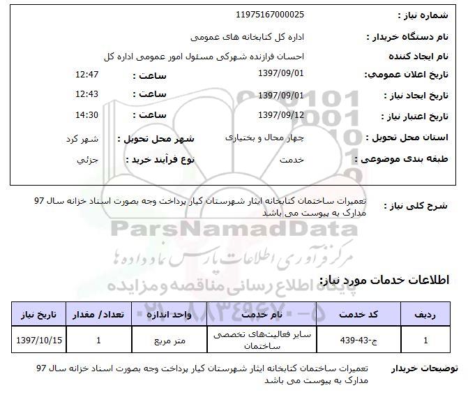 شرح کلی نیاز: تعمیرات ساختمان کتابخانه ایثار شهرستان کیار پرداخت وجه به صورت اسناد خزانه سال 97 مدارک به پیوست می باشد.