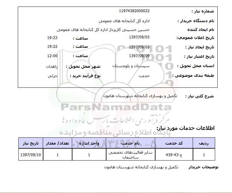 توضیحات خریدار تکمیل و بهسازی کتابخانه شهرستان هامون