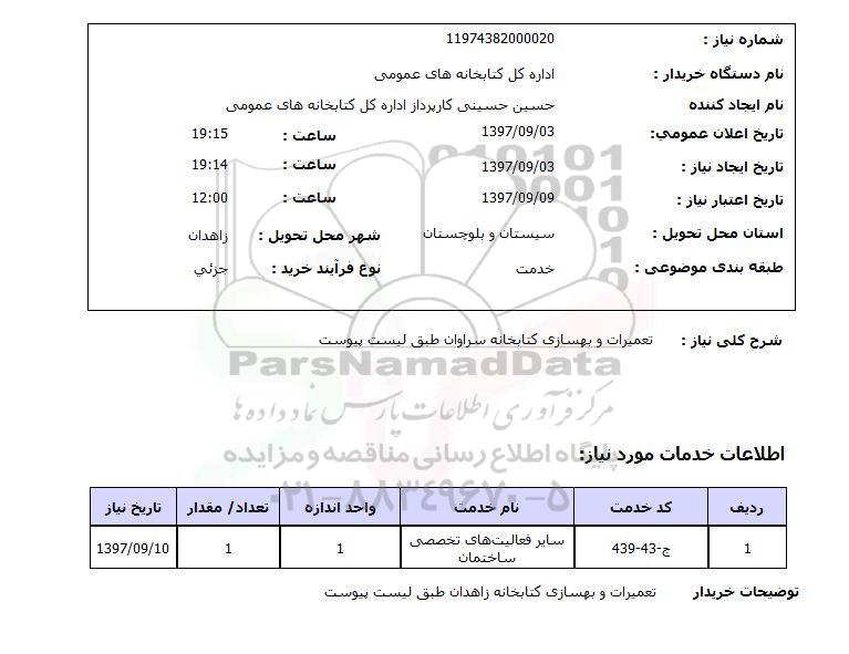 شرح کلی نیاز: تعمیرات و بهسازی کتابخانه سراوان طبق لیست پیوست