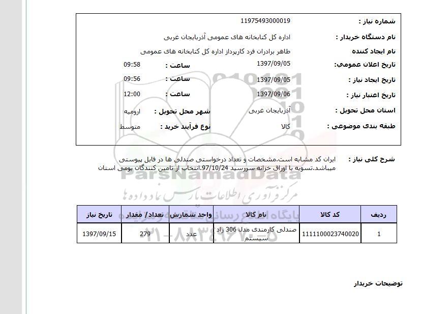 شرح کلی نیاز: ایران کد مشابه است مشخصات و تعداد درخواستی صندلی ها در فایل پیوستی می باشد. تسویه با اوراق خزانه سررسید 97.10.24 . انتخاب از تامین کنندگان بومی استان