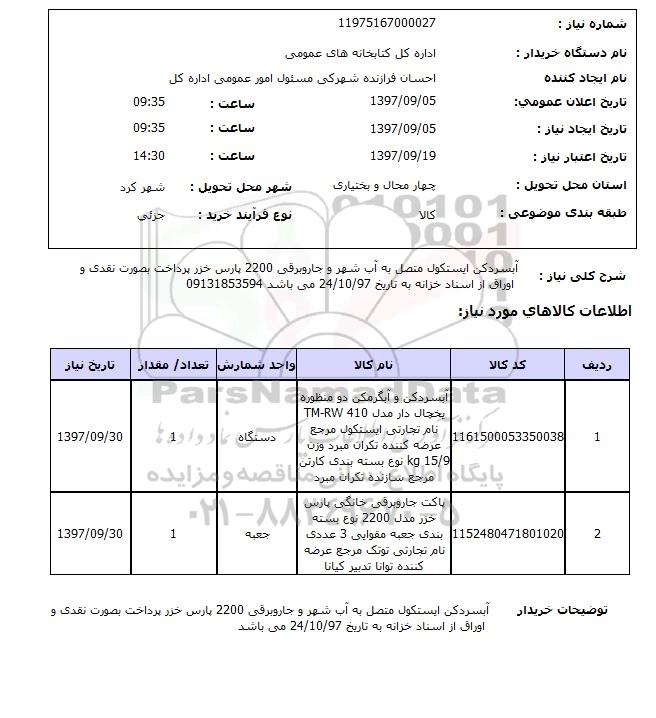 شرح کلی نیاز:  آبسردکن ایستکول متصل به آب شهر و جاروبرقی 2200 پارس خزر پرداخت بصورت نقدی و اوراق از اسناد خزانه به تاریخ 97.10.24 می باشد 09131853594