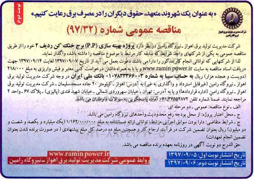 شرکت مدیریت تولید برق اهواز - نیروگاه رامین در نظر دارد پروژه بهینه سازی (P.P) برج خنک کن ردیف 2 خود را از طریق مناقصه عمومی به یکی از شرکت های واجد شرایط که سابقه کار مرتبط با موضوع مناقصه را داشته باشد، واگذار نماید.