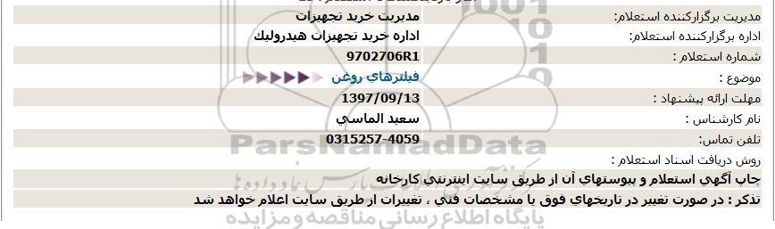 اداره برگزارکننده استعلام: اداره خرید تجهیزات هیدرولیک