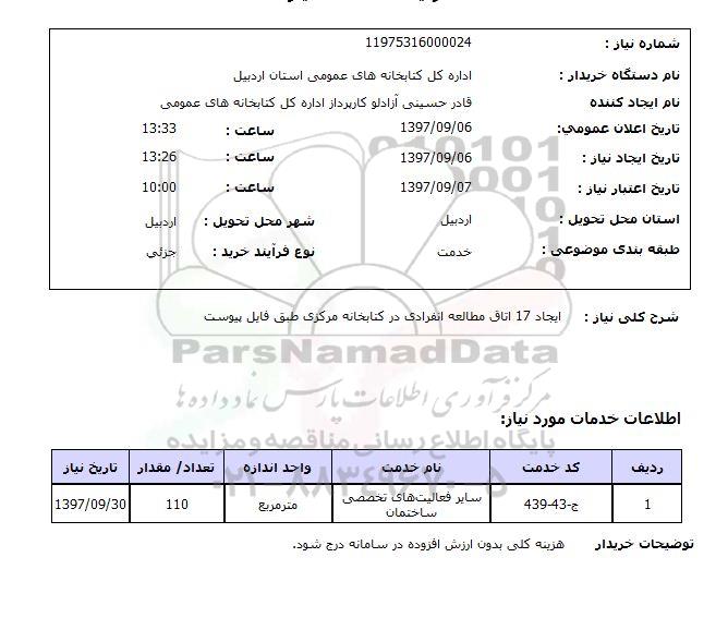 شرح کلی نیاز: ایجاد 17 اتاق مطالعه انفرادی در کتابخانه مرکزی طبق فایل پیوست