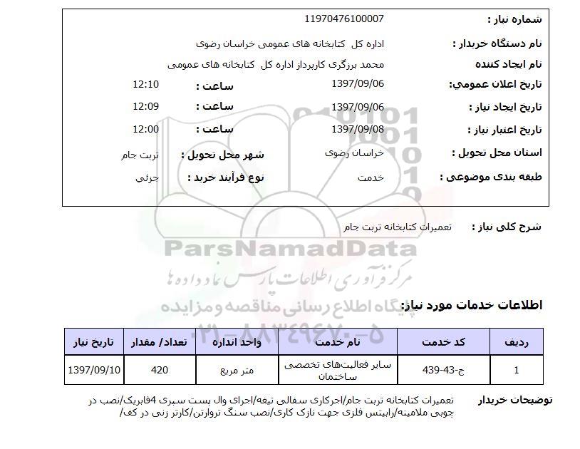 شرح کلی نیاز: تعمیرات کتابخانه تربت جام