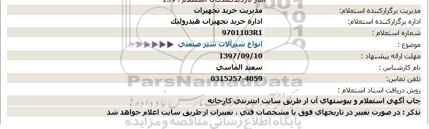 اداره برگزارکننده استعلام: اداره خرید تجهیزات هیدرولیک