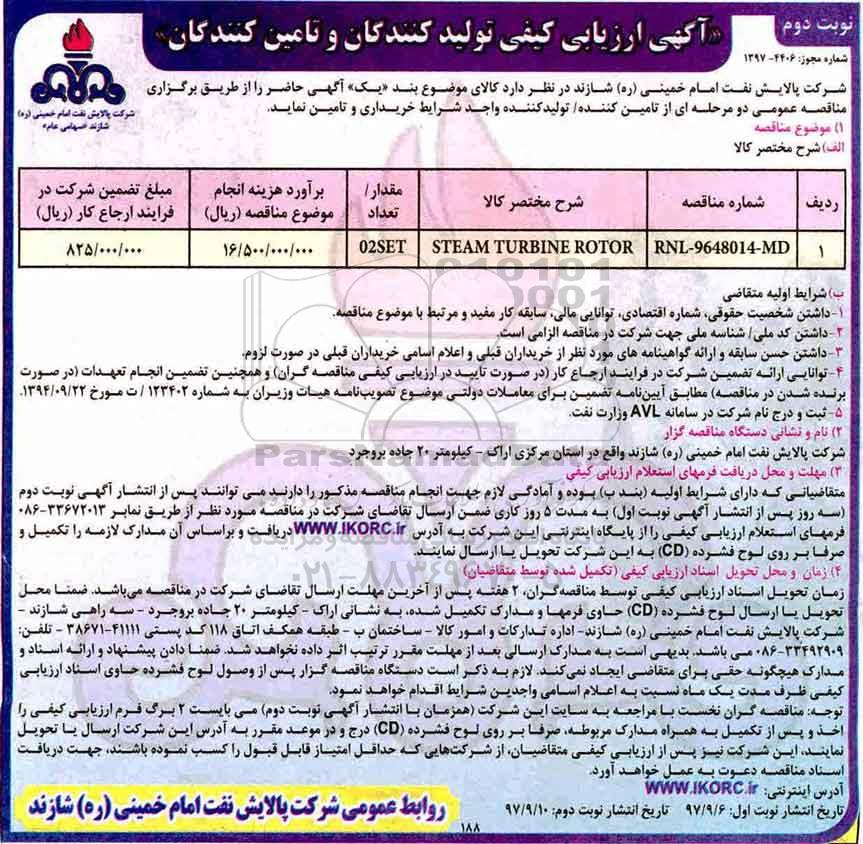 آگهی ارزیابی کیفی STEAM TURBINE ROTOR - نوبت دوم از کلیه افراد متخصص و شرکتها واجد شرایط دعوت به عمل میآید در مناقصه با کد خبرگزاری پارس نماد: 1396741 شرکت نمایند.