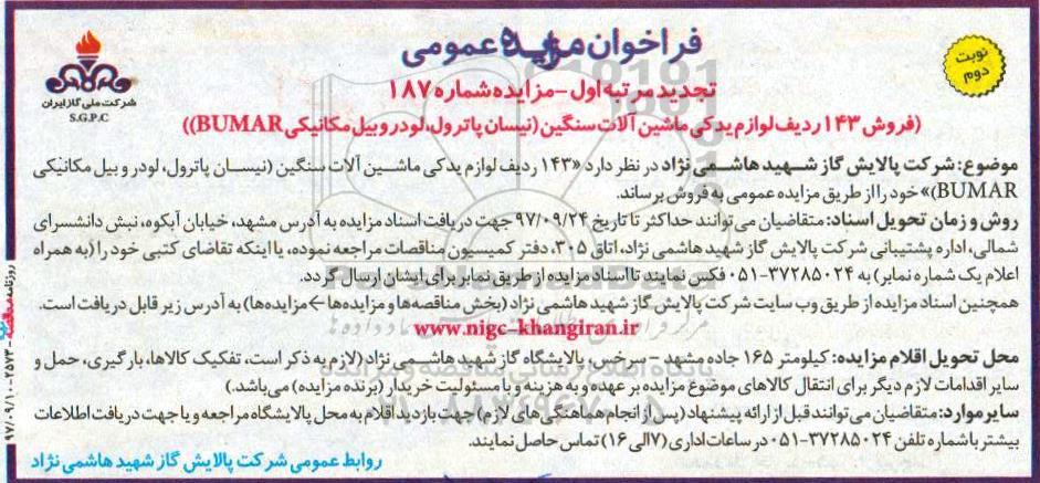 موضوع: شرکت پالایش گاز شهید هاشمی نژاد در نظردارد (143 ردیف لوازم یدکی ماشین آلات سنگین (نیسان پاترول، لودر و بیل مکنیکی BUMAR) خود را از طریق مزایده عمومی به فروش برساند.