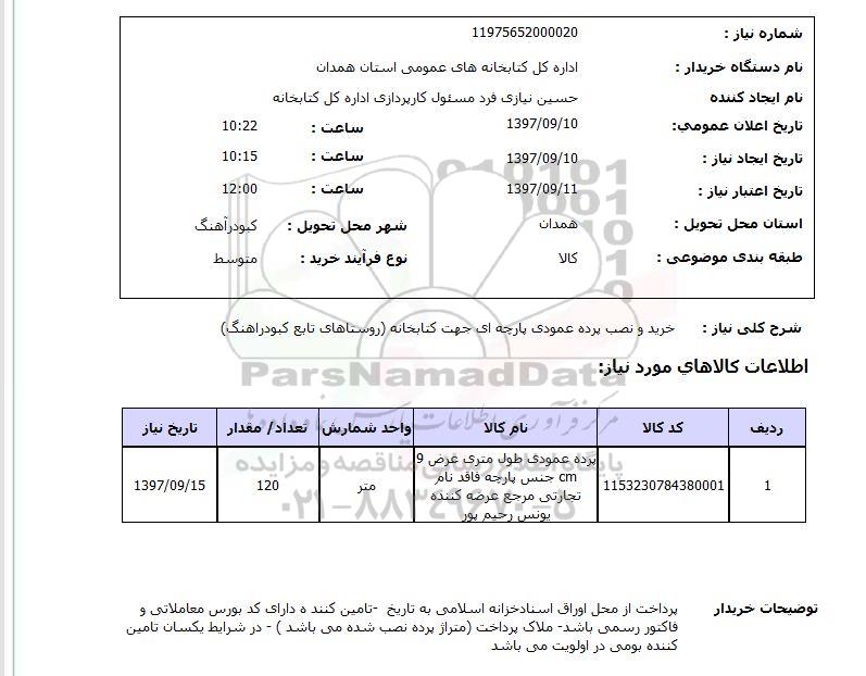 شرح کلی نیاز: خرید و نصب پرده عمودی پارچه ای جهت کتابخانه (روستاهای تابع کبودرآهنگ)